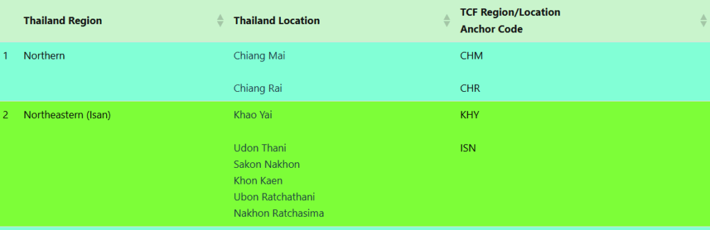 The associated table shows the regions and the TCF Code, Relative Location and Region